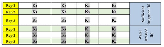 I1 (sufficient water) and I2 (water stress) indicate the main treatments applied to plots, and K1 (0 K2O ha−1), K2 (40 kg K2O ha−1), K3 (80 kg K2O ha−1) and K4 (120 kg K2O ha−1) indicate the sub-treatments applied to plots. The treatments were laid out according to a spilt-plot design. Rep = treatment replication.