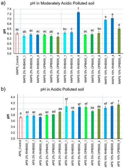 Soil pH in control and amended pots after 65 days of incubation for (a) moderately acidic polluted soils (MAPS) and (b) acidic polluted soils (APS). Different letters indicate differences among treatments in each soil (p < 0.05).