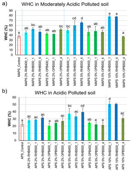 Water-holding capacity in control and amended soils after 65 days of incubation in (a) moderately acidic polluted soils (MAPS) and in (b) acidic polluted soils (APS). Different letters indicate differences among treatments in each soil (p < 0.05).