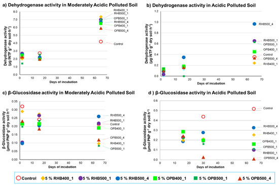 The DHA values obtained were 10 times higher in MAPS than in APS, which is best explained by the higher acidity and heavy metal concentration in the latter (Figure 1 and Figure 3 and Table 1). Comparable observations were described by Frankenberger and Johanson [40], Shuler and Kargi [41], Wolińska and Stępniewska [23] and Campos et al. [42]. Irrespective of the kind and amount of added biochar, DHA increased in all MAPS after 65 days (from 4.1 up to 5.9–7.4 µg INTF g−1 dry soil h−1), which may be related to declining metal availability (CaCl2-extractable contents of Cd, Pb, Zn, Ba and Mn; Table 3). This reduction was caused due to the amendment addition as it was also suggested by Pérez de Mora et al. [38] and Moore et al. [43]. In APS, the application of 5% of RHB500_4, RHB500_1 and OPB500_1, increased DHA at 65 days. As this parameter is only applicable for living cells [44], its increment after biochar application can be related to an improvement of the microbiological biomass of soil [45].