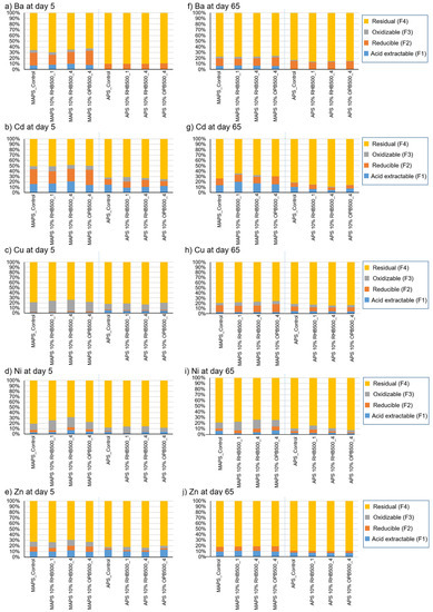Fractions of heavy metals extracted from soils in each step of sequential extraction: (a) Ba after 5 days of incubation, (b) Cd after 5 days of incubation, (c) Cu after 5 days of incubation, (d) Ni after 5 days of incubation, (e) Zn after 5 days of incubation, (f) Ba after 65 days of incubation, (g) Cd after 65 days of incubation, (h) Cu after 65 days of incubation, (i) Ni after 65 days of incubation and (j) Zn after 65 days of incubation.