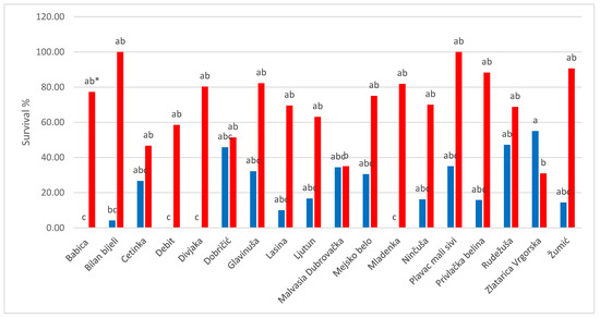 The survival of cultivars in two growth phases (before and after flowering). Blue columns represent the growth phase before flowering, and the red columns represent the growth phase after flowering. * Different letters represent significantly different values among cultivars within growth phase according to Duncan’s test, p ≤ 0.05.