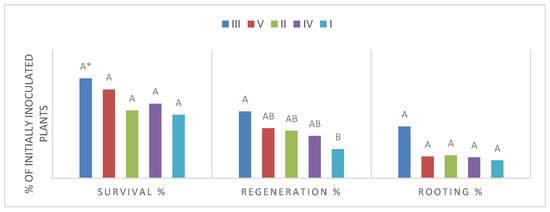 Effect of sanitary status on the survival, regeneration and rooting. Category of virus infection: I—GLRaV-3; II—GLRaV-1 + GLRaV-3; III—GLRaV-1 + GLRaV-3 + GFLV; IV—GFLV; V—GLRaV-3 + GFLV. * Different letters represent significantly different values according to Duncan’s test, p ≤ 0.05.