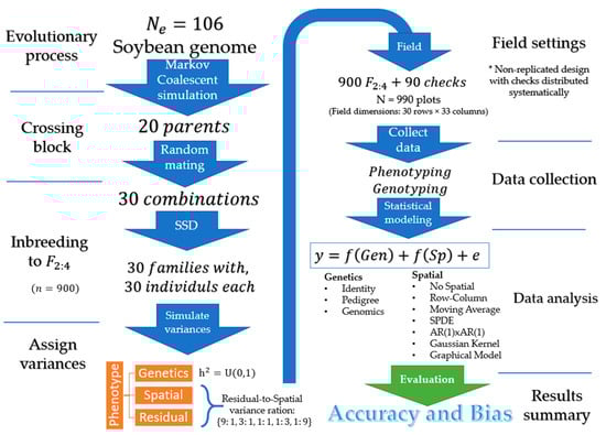 This section describes the general simulation settings, including the simulated genome, creation of the founder population and breeding parents, the experimental design, and simulated variance components. An overall representation of the simulation settings is provided in Figure 1. The next sections are reserved for the description of statistical models and the implementation details.