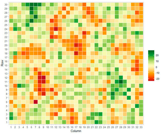 Field spatial patterns were simulated from a stationary Matérn covariance function [39]. This function is commonly utilized for the simulation of spatial gradients in two-dimensional projections [40,41,42]. The signal from Matérn processes can be adequately recovered from most spatial procedures such as Gaussian kernels, splines, and auto-regressive moving averages [43]. A simulated field is presented in Figure 2.
