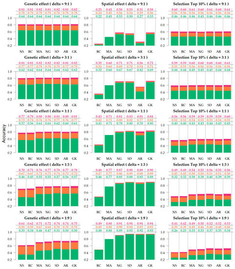 Accuracy of genetic effect, spatial effect, and selection, under varying residual-to-spatial variance ratios (). Colors correspond to the genetic relationship: Identity (green), pedigree (orange), genomics (red). Spatial adjustment methods on x-axis: no spatial adjustment (NS), row-column (RC), moving average covariate (MA), autoregressive AR1 × AR1 (AR), SPDE (SD), nearest neighbor graph (NG), and Gaussian kernel (GK).