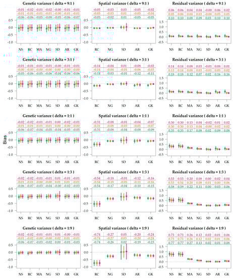 The biases of the variance components are illustrated in Figure 4, and the marginal averages across delta scenarios are provided in Table 1. Supplementary Tables S3 and S4 present the marginal averages for the different combinations of relationship, spatial method, and delta. For all purposes, bias values closer to zero are desirable and an estimator is considered unbiased if the bias is exactly zero. Herein, bias indicates if certain parametrizations are under-or over-estimating the variances attributed to the different model terms. For the methods NS and MA, estimators of spatial variance () are not computed, so the bias is not available. On the row-column parametrization (RC) the estimated spatial variance was the sum of the variances attributed to the row and column terms.