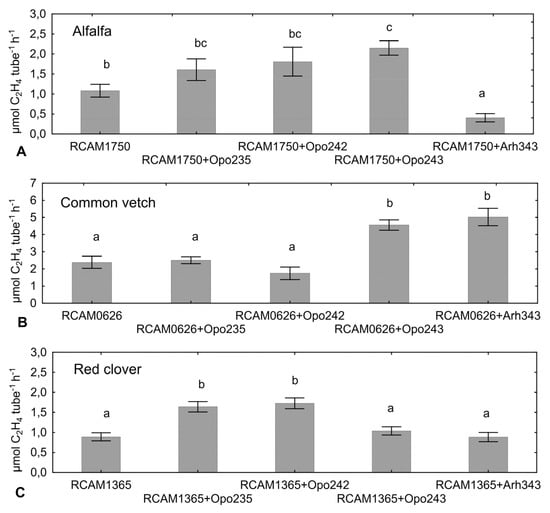 Acetylene reduction activity level in variants of mono- and co-inoculation of alfalfa (A), common vetch (B) and red clover (C) with the commercial strains S. meliloti RCAM1750, R. leguminosarum RCAM0626 or R. leguminosarum RCAM1365, respectively, and the isolates from the relict legumes. Different letters show significant differences between treatments (Fisher’s LSD test, p < 0.05). Vertical bars represent SE.