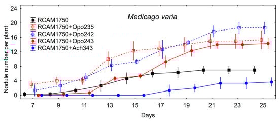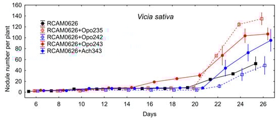 The data of plant nodulation experiment on mono- and co-inoculation of common vetch with the commercial strain R. leguminosarum RCAM0626 and the isolates are shown in the Table 7. Unlike alfalfa plants, the isolates themselves did not form nodules or tumors on the common vetch roots. Isolate M. kowhaii Ach-343 increased nodule number when co-inoculated with R. leguminosarum RCAM0626, while the isolate M. japonicum Opo-242 had no effect on this parameter. The level of total nitrogen-fixing activity enhanced upon co-inoculation with R. leguminosarum RCAM0626 and Bradyrhizobium sp. Opo-243 or M. kowhaii Ach-343 (Figure 1). However, this was associated with the formation of a significantly larger number of nodules, but not with their activity per one nodule (data not shown). An increase in the nodule number and the level of nitrogen-fixing activity had practically no effect on the plant biomass (Table 7). It is possible that some unknown growth limiting factors were presented under model gnotobiotic conditions and a potential of such symbiosis for biomass production could be more pronounced under optimal conditions. The study of the nodulation rate on the common vetch roots showed that only Bradyrhizobium sp. Opo-243 contributed to a significantly faster nodule formation compared to inoculation with R. leguminosarum RCAM0626 (Figure 4).