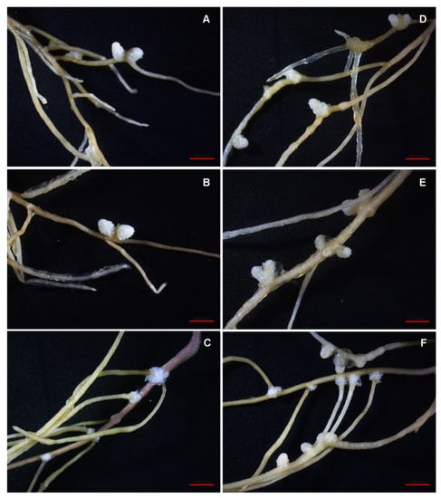 Pictures of the alfalfa roots in the sterile nodulation assay. Variants of mono-inoculation: (A) commercial strain S. meliloti RCAM1750, (B)—isolate M. japonicum Opo-235, (C) isolate Bradyrhizobium sp. Opo-243; variants of co-inoculation: (D) S. meliloti RCAM1750 + M. japonicum Opo-242, (E) S. meliloti RCAM1750 + M. japonicum Opo-235, (F) S. meliloti RCAM1750 + Bradyrhizobium sp. Opo-243. Scale bar = 0.5 mm.