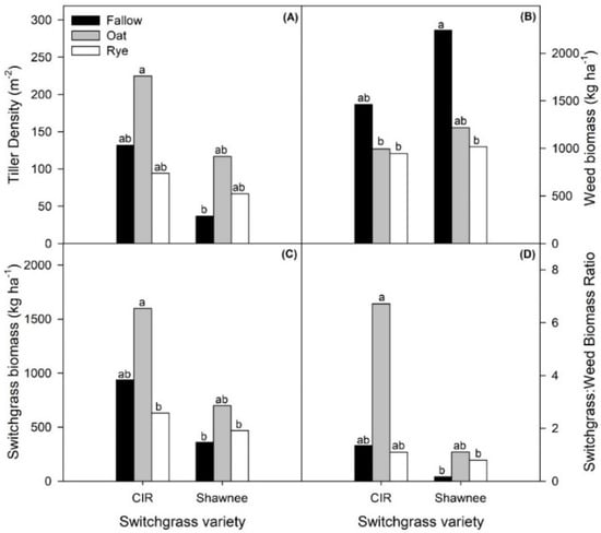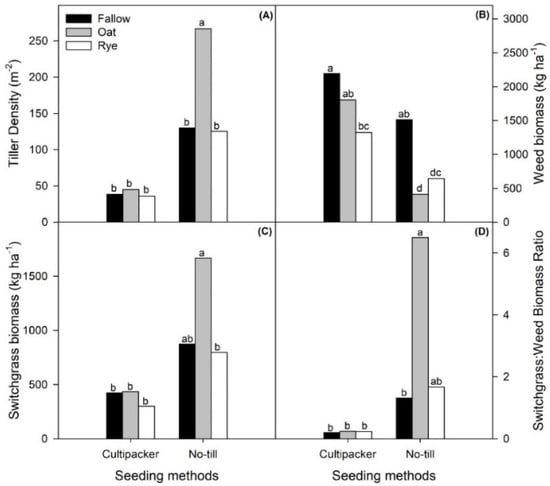 Significant interactions of cover crop with seeding method (p < 0.05) and of seeding method with variety (p < 0.05) were also observed. While cover crops had no effect on switchgrass tiller density when the cultipacker was used, a combination of oat as the cover crop with no-till drill increased switchgrass tiller density. In the no-till systems, switchgrass tiller density was 267 tillers m−2 after oat, and 125 and 130 tillers m−2 after rye and fallow, respectively (Figure 1A).