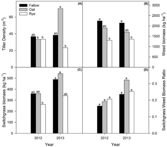 Cereal cover crops have been shown to be effective in reducing weed biomass, but growers are concerned that cover crops could reduce the tiller density and biomass production of the cash crops as well [47,48]. Sadeghpour et al. reported rye is an excellent crop to control weeds, but found lower switchgrass tiller density in rye but improved switchgrass tiller density with oat, in line with findings of this study [28]. In Experiment 2, Shawnee’s tiller density was consistently low after rye as a cover crop, reflecting the difficultly of establishing it in rye. This could be due to rye’s extensive root system, which makes it difficult to plant into, and the fact that rye has allelopathy [24,25,26]. One strategy to avoid such an issue is to skip the cash crop row when planting rye. This decreases the intersecting zones between a cash crop and the rye cover crop, and improves the cash crop’s establishment [48].