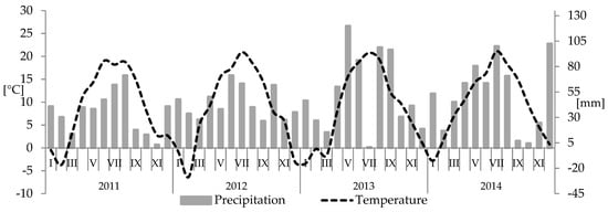 The trial was located in an experimental orchard in Warsaw, Wilanów in Central Poland (N 52°9′36.1″, E 21°5′58.2″). The weather data for the experimental location are presented in Figure 1. They were collected using the Davis Vantage Pro 7 field weather station installed in the orchard. The material consisted of control plants (non-inoculated trees) and inoculated trees of cultivars ‘Topaz’, ‘Odra’, and ‘Chopin’ and a bred clone U 8869 in organic fruit growing conditions. The knip trees on M.9 rootstock were planted in spring 2011 with 3.5 × 2 m spacing on a silty-loam alluvial soil within a split-block experimental design with 4 replications, and 3 trees per plot with 6 buffer trees between non-inoculated and inoculated plant blocks. Trees were trained in a spindle bush training system. Floor management in the orchard involved mowing the grass of the alleyways 3 to 5 times per season (depends on weather conditions) and mechanical tillage kept in rows of trees using a tractor-mounted rototiller-type tool equipped with a hydraulic system, enabling access to the area between trees, and the soil was tilled up to 5 cm deep twice in a growing season in April and October.
