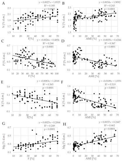 Linear relationships between mycorrhizal parameters (F—mycorrhizal frequency and AMI-absolute mycorrhizal intensity) and macroelement concentration (N-nitrogen, P-phosphorus, K-potassium, and Mg-magnesium) in tested apple tree leaves during 2012–2014 (A–H).