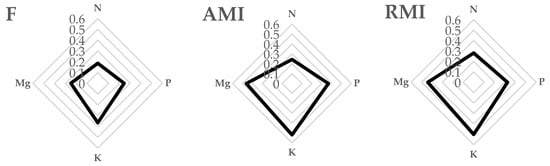 Regression analysis showed that there were varying relationships between mycorrhizal parameters and leaf mineral content (Figure 2). Their direction was similar; namely, higher F, AMI, and RMI values were positively correlated with higher leaf N and Mg contents and, simultaneously, lower phosphorus and potassium contents. The significance of these correlations depends on the parameter, and stronger correlations were recorded for RMI and AMI compared to F, as shown in Figure 3. AMI and RMI relationship with magnesium and potassium content in leaves was almost two-fold higher than the same parameter calculated for F.