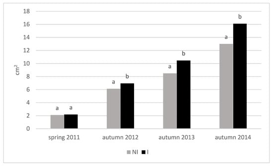 Trunk sross-sectional area TCSA of apple tree depends on inoculation with AMF + PGPR during the course of trial; mean for cultivars (means marked with the same letter within term do not significantly differ at p ≤ 0.05 according to the Newman–Keuls test). NI: non-inoculated; I; inoculated.