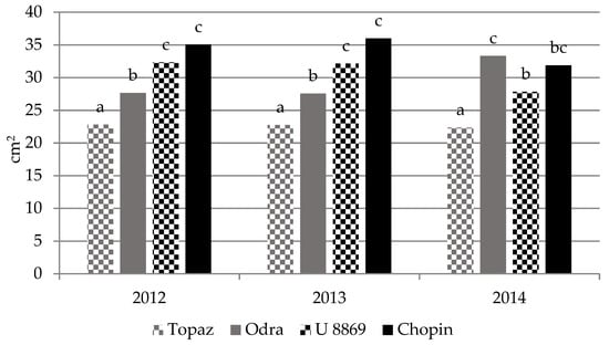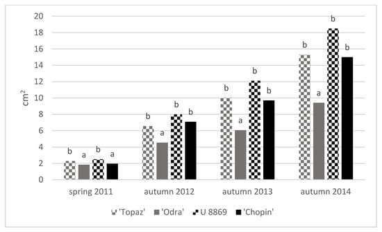 Leaf area of apple tree depends on cultivar during the course of trial; mean for treatments (means marked with the same letter within term do not significantly differ at p ≤ 0.05 according to Newman–Keuls test).