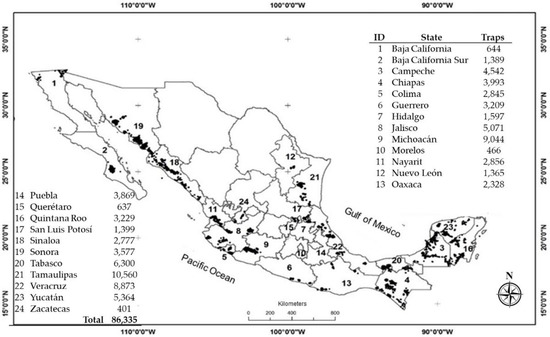 We used data from the nation-wide trapping program that monitored ACP in the 24 citrus producing states of Mexico during 2015. Yellow sticky traps numbering 86,335 were used to sample the occurrence of ACP adults in Mexican citrus. The traps were made of yellow laminated cardboard that were rectangular shaped and 15 × 22 cm in size. They were installed at 1.5–2 m above the ground on trees located in the perimeter of the grove and in the free frontal side of the tree canopy. They were placed every 200 m in strategically selected groves within the Mexican area-wide management of HLB-ACP named Regional Control Areas (ARCOs), which were established at a national level [34,35]. The geographic distribution of the traps by state is shown in Figure 1.
