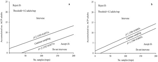 Decision stop lines of the SPRT sequential sampling plans for the Asian citrus psyllid. Threshold = 0.2 ACP adults/trap. (a) Veracruz state. (b) Michoacán state.