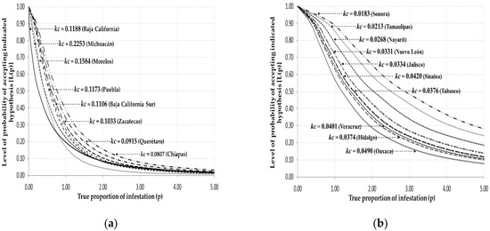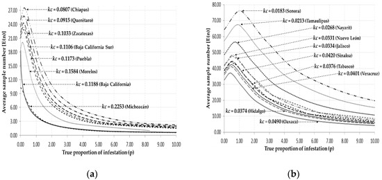 In the obtained values of kc, we noticed a response similar to the one shown by Nyrop and Binns [63], whose results indicated that kc is higher at high densities as well as the existence of a trend in its increase as the population density grows (Table 1, Figure 3a,b and Figure 4a,b). They also specified the changes observed in the form of the OC and ASN functions depending on the value of kc, which were steeper and shifted to the left along the mean density when the value of kc was higher (Figure 3a and Figure 4a) or flatter and shifted to the right when such value was lower (Figure 3b and Figure 4b). In our study, the citrus producing states that showed a high kc value had high probability values for a correct decision for intervention in the OC function, while the number of samples needed to make a decision was relatively low in the range of 8–27. On the contrary, the states with a minimum kc value had higher probability values for a correct decision for intervention in the OC function, while the number of samples needed to make a decision was almost three times as high compared to the high kc value group (Table 4, Figure 3a,b, and Figure 4a,b).