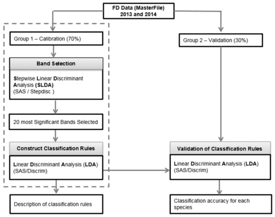 Stepwise linear discriminant analysis (SLDA) was run to identify 20 significant bands in the calibration data via the STEPDISC procedure using SAS (SAS Institute, North Carolina State University, United States of America (USA)) software. The linear discriminant analysis was constructed using the “rule set” from the 20 significant bands. Then, the validation data were run with the same “rule set” to verify the accuracy.