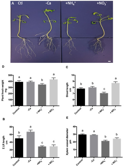Tomato seedling response to calcium deficit or ammonium and nitrate excesses in in vitro experiment. Tomato seedlings were grown with control media, with a calcium deficit, or with ammonium or nitrate excesses for 10 days in a growth chamber as described in the Materials and Methods section. Tomato images were taken 10 days after sowing the seedlings: (A) representative image of seedlings; (B) sum of lateral root length; (C) shoot length; and (D) plant fresh weight. Xylem vessel diameters (E) were measured by light microscopy (40×). a, b, c represents statistically significant differences with p < 0.05.