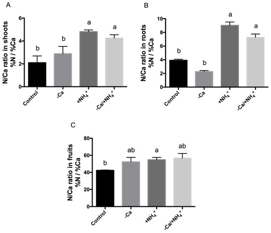 N/Ca ratio was altered in tomato plants with ammonium excess in in-pot experiments. At 132 days after germination, the plants were dissected, and total nitrogen and total calcium were quantified as a percentage of plant dry weight. Nitrogen/calcium ratios were calculated for shoot (A), root (B), and fruit (C) tissue. a, b represents statistically significant differences with p < 0.05.