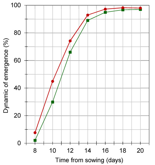 Plant emergence in all pots were determined in the period from 12 h after the appearance of the first cotyledons to the moment until no new plants appeared. The emergence dynamic index (Ed) was calculated from the following formula: