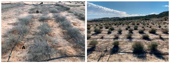 Productive blocks. (Left) H. sessiliflorum in a 12-plant block. Block A and B with 5 m space between blocks. (Right) H. almeriense, spaced at 1.5 × 1.5 m and arranged alternately within the rows.