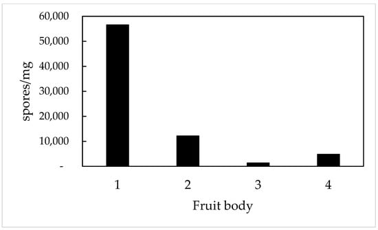 Variability of spore yields in four different fruit bodies of T. boudieri. Four tissue samples were taken from each fruit body and ground (with pestle and mortar) in water. The extracted spores were counted under a light microscope.