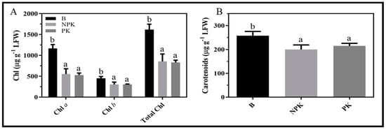 Application of Bacillus spp (designated B) to H. ledifolium roots increased the contents of chlorophylls (A), and carotenoids (B) in plant leaves. Plants were grown in pots. PK—Control. Pots were treated only with 100 ppm PK. NPK—Nitrogen enrichment treatment. Pots were supplied with 100 ppm NPK. B—Bacillus spp treatment. Pots were treated with 100 ppm PK + 107 Bacillus cells/g soil. All treatments received similar amount of water per irrigation. Data are means; error bars indicate ±SE’s (n = 5). Significance is indicated by lower case letters and was calculated according to Tukey’s multiple comparisons test (α ≤ 0.05).