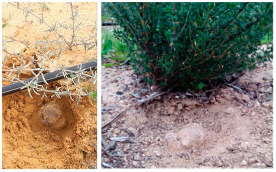 The first step is selection of the suitable host—a perennial species rather than an annual species. Each desert truffle species forms mycorrhizal associations with several host species (e.g., [,]), but there is usually an abundant host in the area to be cultivated, and this species should initially be the one chosen. In Israel’s Negev desert, for example, the indigenous most common host species for T. boudieri is H. sessiliflorum. In Spain, H. almeriense was initially chosen as the host for T. claveryi, but other species, such as H. violaceum (Cav.) Pau and H. hirtum (L.) Miller, were tried later and found to be successful hosts for the same fungal species at different elevation ranges.