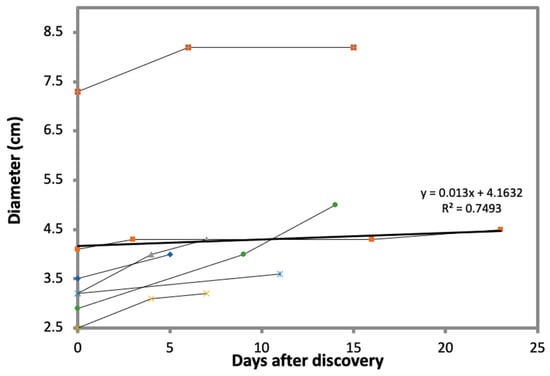 Increase in truffle diameter (cm) when the T. boudieri truffles are left to mature on site. Fruit bodies were left intact in the soil after discovery, and the change in diameter was monitored for up to two weeks. Orange squares and the heavy line represent the average of all fruit bodies. Any increase in radius (x), (x + y) culminates in a higher degree (x) 3, (x + y)3 of difference in volume and weight.