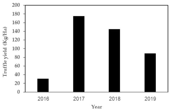 Efforts were undertaken to renew and enhance mycorrhiza in plots. Several methods to increase yields were tried; these included reinoculation with fresh spores and—following a published practice used in stands of the Périgord black truffle, Tuber melanosporum Vittad.—trapping truffles in holes []. However, the results obtained thus far are not reproducible, and much more work is needed to reveal the factors that drive the reduction in productivity when water is not deficient.
