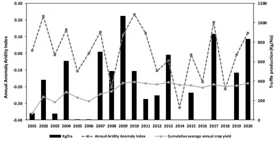 The first agricultural plot of desert truffles established in Murcia, Spain, was followed for 20 years, from 2001 to 2020. Through the years yields fluctuated strongly. The cumulative average of annual crop yield of the plot increased almost linearly until 2009 (Figure 8), when it reached a cumulative average harvest of 379 kg/ha, and it remained almost constant, with a standard deviation of ±14 kg/ha, throughout the remaining years. By the end of the study, the average desert truffle yield was 376 kg/ha/year. However, the yearly yield showed large inter-annual fluctuations, with a standard deviation of ±318 kg/ha. The yield fell to zero (2014) or to less than 2 kg/ha (2005, 2006, 2016, 2018) in very dry years. The largest harvest was in 2009 with 1069 kg/ha (Figure 8). A study aimed at analyzing meteorological factors potentially affecting yields was therefore conducted, and significant correlations were indeed found between yield and several parameters [], particularly the aridity index (AI) (Table 4).