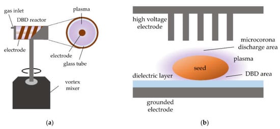 Examples of specialized plasma reactors. (a) dielectric barrier discharge (DBD) reactor mounted onto a vortex mixer; adapted from [20]. (b) hybrid microcorona-DBD configuration affecting the “shadow surface” of seeds; adapted from [21].