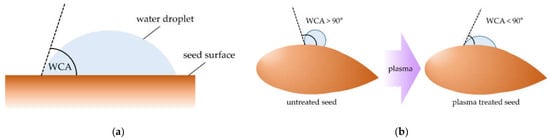 Schematic representation of water contact angle (WCA) measurement on a seed surface. (a) WCA determination; adapted from [49]. (b) WCA decrease on seed after plasma treatment.