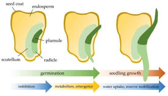 Germination is the process from the first water uptake by the dry seed to the emergence of the radicle, which is the embryonic root of the plant [28]. Germination is complete once the embryo protrudes from the seed, as shown in Figure 4. In experimental practice, criteria to determine germination may vary with regard to seed properties or other specifics. In the reviewed literature, seeds were variously considered germinated when the radicle just emerged, or when the radicle was ≥2 mm in length [48], about 5 mm in length [57], or when the radicle was half the length of the seed [10].