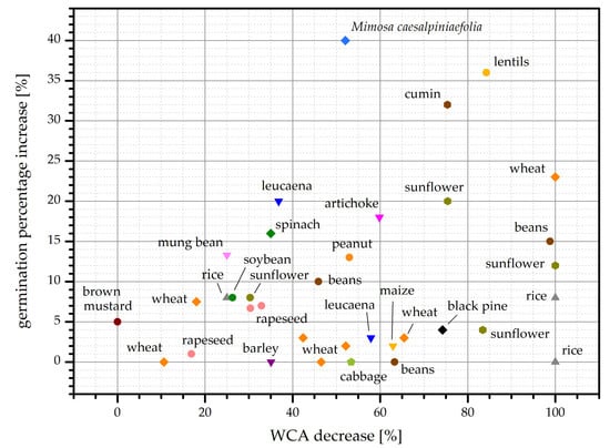 The relation between the water contact angle decrease [%] and final germination percentage increase [%] in the reviewed publications. The same color and shape of a data point represents the same seed species.