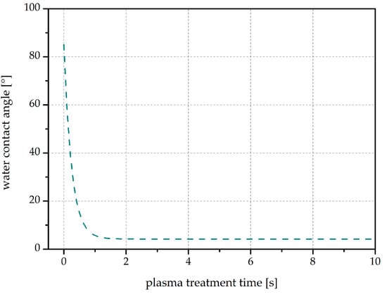 Evolution of the water contact angle on Etna beans with plasma treatment time; exponential trend line is shown. Treatment: O2 plasma, pilot-scale inductively coupled radio frequency plasma reactor, PFW = 400 W, p = 20 Pa [53].