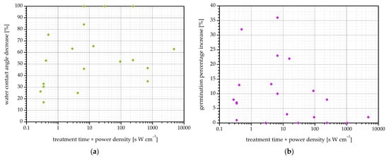 The relation between the product of treatment time and power density and (a) water contact angle decrease or (b) germination percentage increase in the reviewed publications.