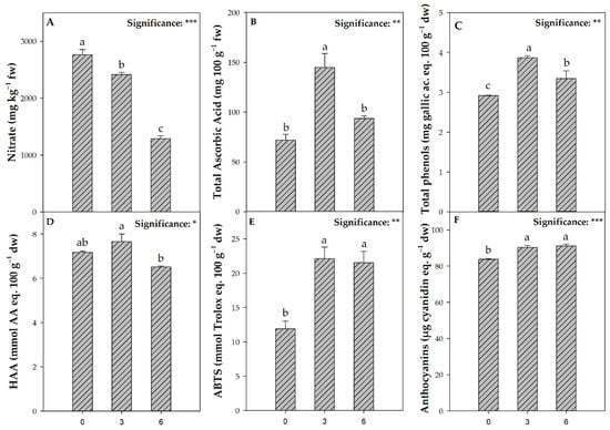 Effect of nutrient solution deprivation at different days before harvest (0, 3, and 6) on the content of nitrate (A), total ascorbic acid (B), total phenols (C), hydrophilic antioxidant activity (HAA) (D), ABTS antioxidant activity (E), and anthocyanins (F) of lettuce grown in floating raft system. Data are mean values ± standard error, n = 3. Mean comparisons were performed by Tukey’s HSD Test (p = 0.05). Different letters indicate significant mean differences. *, ** and *** denote significant effects at p ≤ 0.05, 0.01, and 0.001, respectively. HAA: hydrophilic antioxidant activity, ABTS: 2,2’-azino-bis (3-ethylbenzothiazoline-6-sulfonic acid), fw: fresh weight, dw: dry weight.