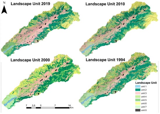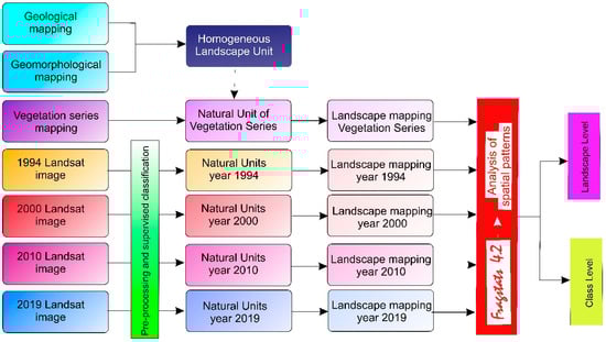 Then, the corresponding unions of the homogeneous unit mappings with the different vegetation mappings obtained from the vegetation series map and supervised classifications from Landsat images of the years 1994, 2000, 2010, 2020 were carried out, giving rise to the natural unit mappings.