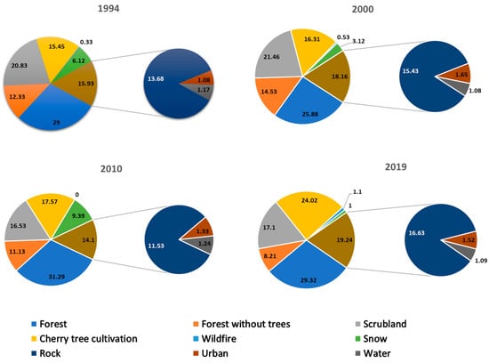 The analysis of the areas of occupation of the different types of land use allows a preliminary evaluation of the evolution of the territory. As previously mentioned, the landscape is a dynamic entity in continuous spatial and temporal evolution []. The environmental mosaic present in the Jerte Valley is quite heterogeneous and, therefore, the agents that cause these changes are diverse. The most important are: geomorphological agents in the areas of rock and bare soil, where they are the main modelers of the landscape together with the climate; and, in the areas dominated by vegetation, (geobotanical landscape) it is the plants that modify the edaphoclimatic conditions of the area. In addition, we are in a territory with a growing human influence, which determines a much more accelerated time scale of changes due to the disturbances caused by their activities.