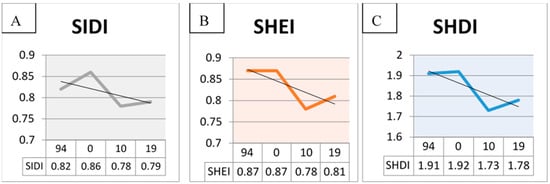 Diversity indices, the thick lines are the values of the indices in the different years, the thinner lines are the trend of each index. (A) Graph of Simpson’s Diversity Index, (B) Graph of Shannon’s Evenness Index, (C) Graph of Shannon’s Diversity Index.