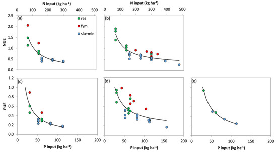 Relationship between nitrogen (a,b) and phosphorus (c–e) fertilisation levels and the average output-to-input ratio (i.e., NUE and PUE) for winter wheat (a,c), maize (b,d), and soybean (e) during the long-term experiments. The black line represents the interpolated hyperbolic model, and the points represent LTE observations, clustered according to the different agronomic inputs, i.e., res: crop residues incorporation in green, fym: farmyard manure in red, and slu+min: slurry + mineral fertiliser application in blue.