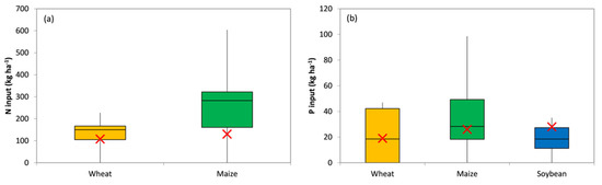 Nitrogen (a) and phosphorus (b) supplies under real-field conditions for the studied crops irrespective of agronomic management. N = 28, 35, and 28 for wheat, maize, and soybean, respectively. The balancing points (i.e., output-to-input ratio equal to 1) are estimated from the LTE interpolations and identified using red x symbols.
