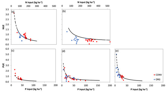 The NUE and phosphorus use efficiency (PUE) were calculated as an output-to-input ratio where a value < 1 reflected nutrient loss and/or soil enrichment and a value > 1 reflected soil nutrient mining.