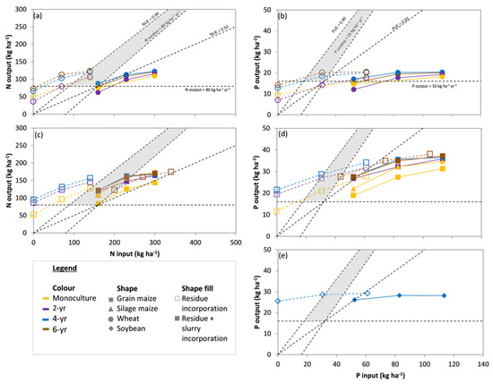Graphical presentation of the nitrogen (a,c) and phosphorus (b,d,e) use efficiency (UE) in the long-term experiment winter wheat (a,b), maize (c,d) and soybean (e), identified according to crop rotations using colour (monoculture, 2, 4, and 6 yr) and characterised by different residue managements using fill (residue incorporation and residue + slurry incorporation). The lines corresponding to nutrient UE = 0.90, desired maximum surplus, UE = 0.50, and desired minimum productivity create the “sustainability area” (in light grey).