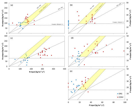 Graphical presentation of nutrient use efficiency (UE) using the results of the input vs. output diagram. The lines corresponding to nutrient UE = 0.90, desired maximum surplus, UE = 0.50, and desired minimum productivity create the “sustainability area” (in light yellow). The adopted graph is similar to what was reported by EU Nitrogen Expert Panel [13] for N.